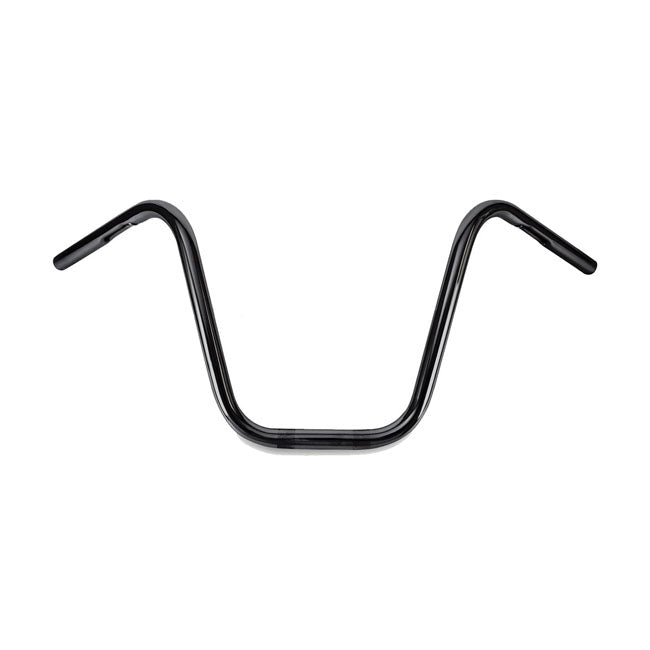 Black powder coated. Dimpled. The narrow lower section of this bar will especially compliment bikes with narrow forks. Approx. dimensions: 32.5" wide x 12" rise x 7" pullback.