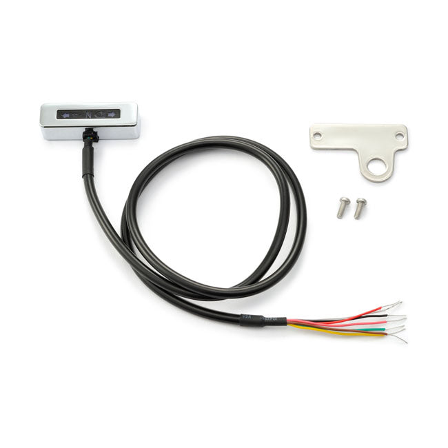 CNC machined aluminum body with 5 LED indicators for Neutral (green), Hi-Beam (blue), Oil (red) and left/right turn signal (green). Dimensions: 46.8mm wide x 13.8mm high x 11.5mm deep.