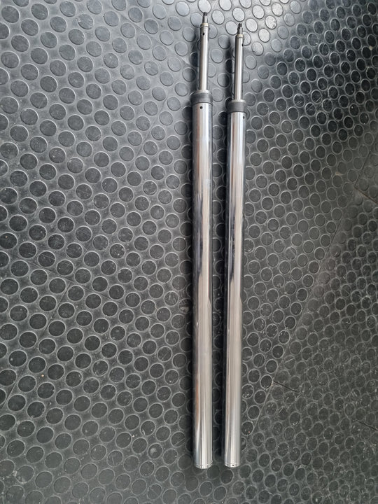 Polished aluminum lower fork sliders. Single disc. Complete with a chrome triple tree set and include 41mm fork tubes, lower sliders, hard chromed fork tubes complete with all internal components and fork plugs. Ready to install. Takes stock type disc brake caliper. Made as an OEM style replacement, but don't let that stop you from using them in custom applications.