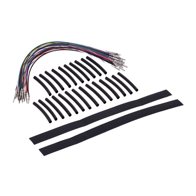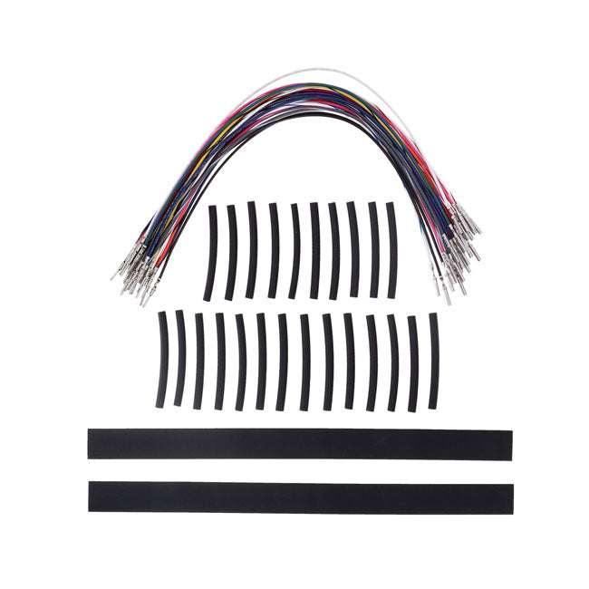 Extended wiring harness kit is for bikes where wider or higher handlebars are installed. OEM color coded and pre-attached wire ends for stock motorcycles. Includes 24 wires. Includes throttle extensions.