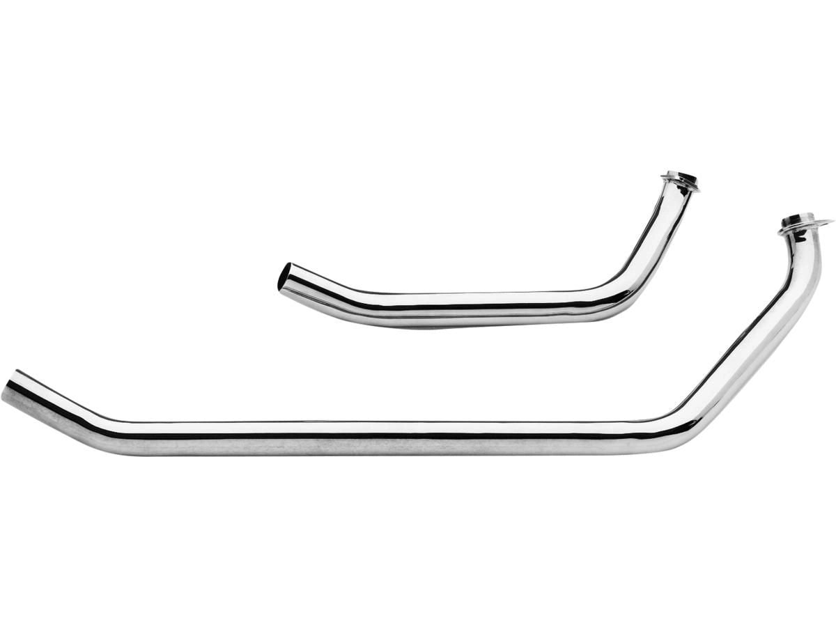 Chrome. 1-3/4" head pipes. If so desired mufflers can be mounted. Rear pipe wraps close around the oil tank and becomes upswept. Swingarm frame. Kickstart. Not compatible with mechanical brakes. Includes Paughco 718J (948457) and 718J2 (848480) rear hanger brackets. Heatshield front 902658, rear 903472.