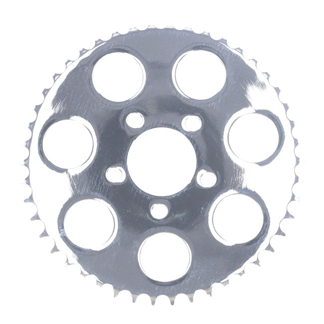 Chrome. Flat (no offset). With 56mm ID and 11.5mm mount holes. Fits Big Twin and XL Sportster when converted from belt to rear chain (excl. V-Rod & 08-up Touring which have rubber pulley dampers).