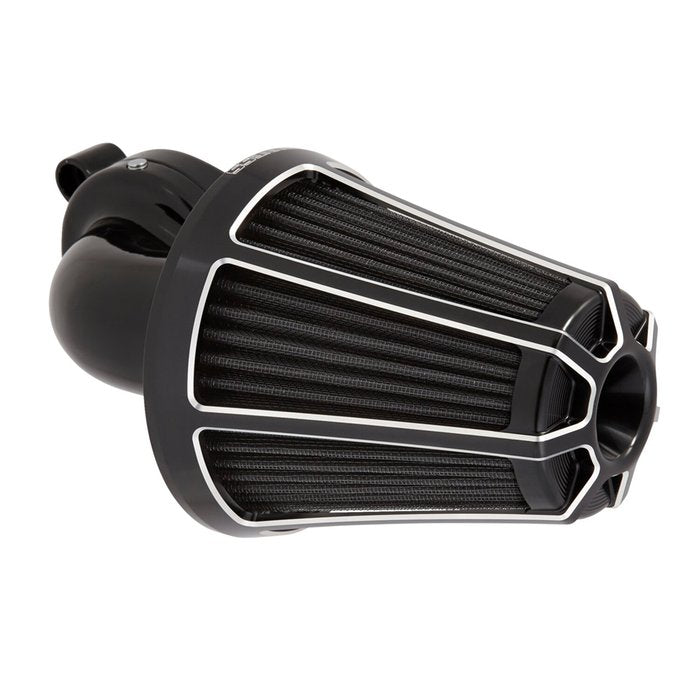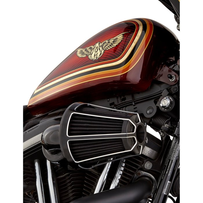 Black anodized billet aluminum with a Contrast Cut machined finish. The Ness Monster Sucker air cleaner comes with the largest filter surface area of all aftermarket 90° air cleaners, which translates to: 'The best breathing 90° air cleaner on the market!' It allows this filter to keep-up with air-demands from bone stock all the way up to massive horsepower spitting engines. Filter elements are constructed from oiled high flow cotton gauze filtering material. The aluminum body is manufactured from precision forged billet aluminum and CNC machined to the Ness standard where perfection is absolute. Hidden patented internal breathers are used to provide efficient breathing combined with the cleanest looks. Note: An optional rain sock is separately available as 590443, for when riding in adverse weather conditions.