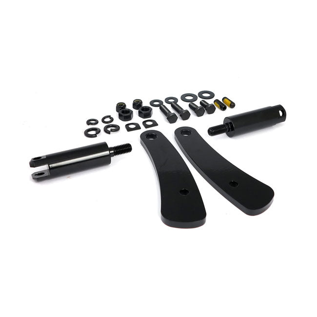 Complete kit to mount any set of male mount rider pegs to the front lower side of the frame. More comfort and space, without having to switch to forward controls. Fits all models with mid-controls. Used with traditional H-D male mount footpegs. Note: Male mount foot pegs must be purchased separately