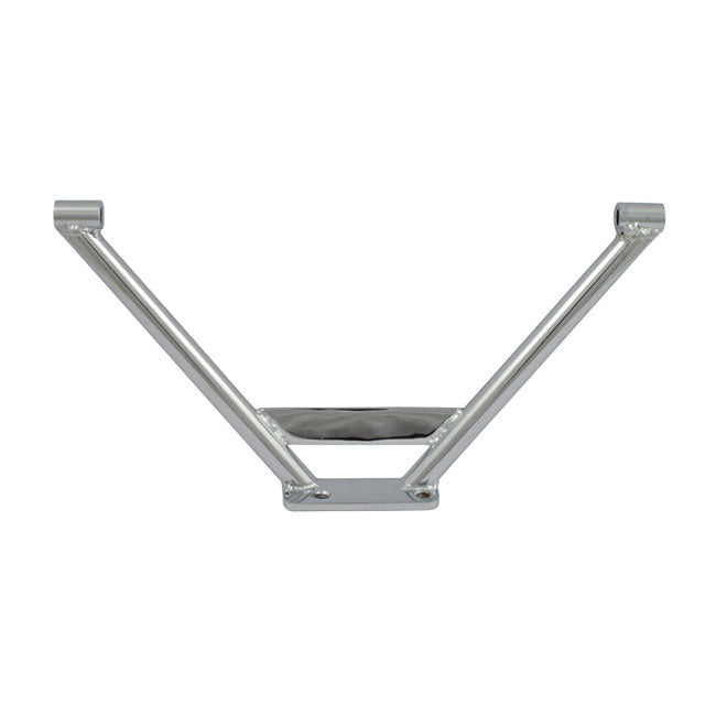 Chrome plated. Universal passenger footpeg bracket for rigid frame models. Mounts behind transmission on transmission base plate.