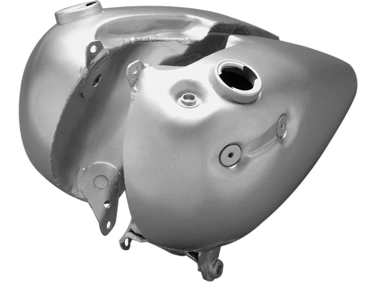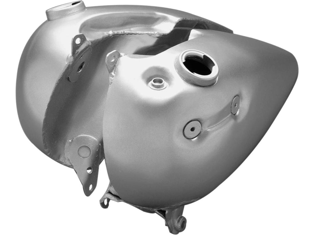 Two versions of the obsolete hand shift style 3.5 gallon gas tank sets. Accurate placement of the shifter gate lugs and shut-off rod hole centers ensures trouble-free service. Available in two versions. One is a totally accurate reproduction of the original, rod-style gas shut-off equipped tank used from 48-65. The other is based on the same tank, but eliminates the early style gas shut-off rod system and replaces it with the tank bottom fitting for the late 13/16" external-thread petcock. Both tanks accept the correct cam-style gas caps and are designed to accept the stock shifter guide. (Sold separately.)
