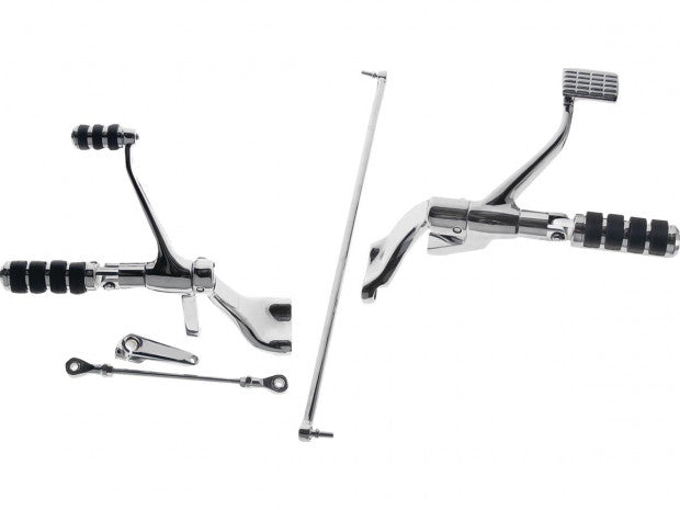 Add that stretched-out look and extend your riding position on your Sportster. These controls feature integrated shift lever and brake lever on the footpeg shaft. Kits includes footpegs, instructions, and mounting hardware. Available in chrome or black finish and in a 2“ extended version.