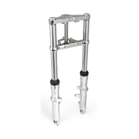 For single disc. With polished aluminum fork sliders. 41mm. Complete kit with hard chromed fork tubes and aluminum lower slider assemblies with all internals and forkplugs. Ready to install. Can be used as stock replacement for 86-99 FLST models with single front caliper. It will also retro-fit all Wide Glide type Big Twin models from 49-83. When used in combination with a 41 mm type Wide Glide triple tree conversion kit this kit will fit most FX and XL models with 35mm and 39mm tubes.