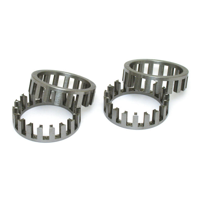 Billet steel retainers. 36-86 B.T. style. Will not fit 00-up Big Twin with pressed-in crankpins. Repl. 24366-51 cages / retainer set only. Note: 87-99 B.T. models can be retro-fitted with the 36-86 roller & retainer style so oversized rollers can be used instead of oversized crankpins. Note: Standard or oversize rollers must be purchased separately.