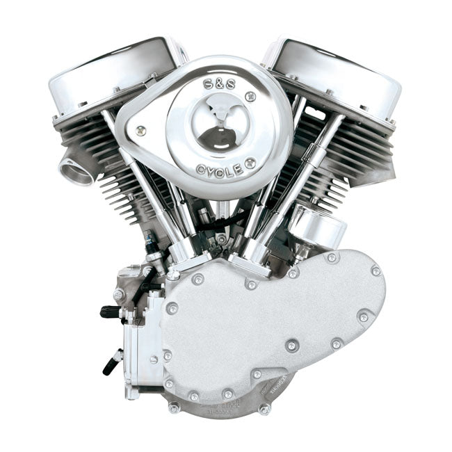 Note: Special Order Product only. Please contact oss to order 93" big bore stroker engine. Comes with 8.5:1 compression ratio and 3-5/8" x 4-1/2" stroke. Super E carb, 585 cam, forged pistons. This is a P-Series, or as we all know it, a Panhead the S&S way. Not a reproduction but a modern engine with retro styling. The cylinders are S&S Shovelhead cylinders and the heads are based on the S&S Shovelhead heads and will take pipes with Shovelhead exhaust flanges. Engine comes complete with S&S carburetor.