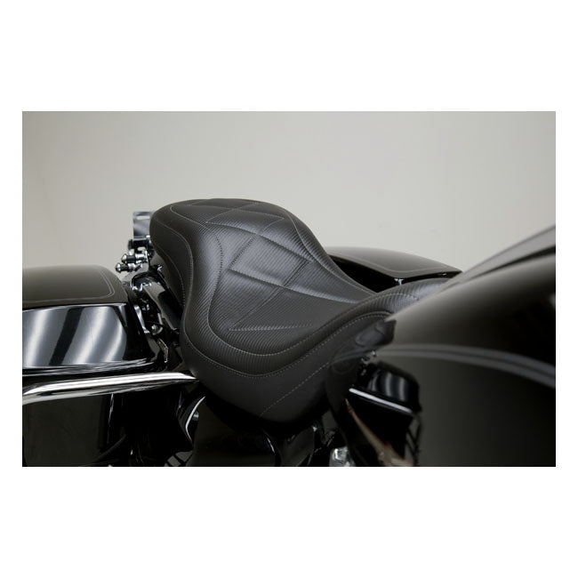 Black. 13.5" front width & 10" rear. Carbon style fiver vinyl center panel with a detailed gun metal stitch. The Super Tripper is a name that says nothing about psychedelic events but everything about the ride quality that is to be expected on longer trips. Built for mean and lean looks but leaves sufficient space for you to keep your bike shining in what it does best: Wrapping up the miles, in comfort. The Super Tripper sits lower and 1" further back when compared to Mustang's Daytripper seats.
