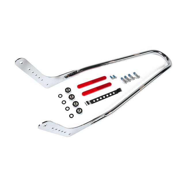 Chrome; One-piece construction; Comes with welded-on side plates; Bolts directly to fender struts; No docking hardware required; Not quick detachable. Note: This sissybar is sleeker than the 'quick detachable' type sissybars.