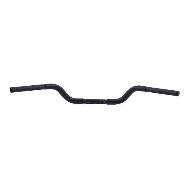 Satin black powder coated; Steel; Similar to the bar on a 2010 Fatboy Low. Approx. dimensions 3 1/4" rise x 33 1/2" wide x 8" center width x 8.5" pullback