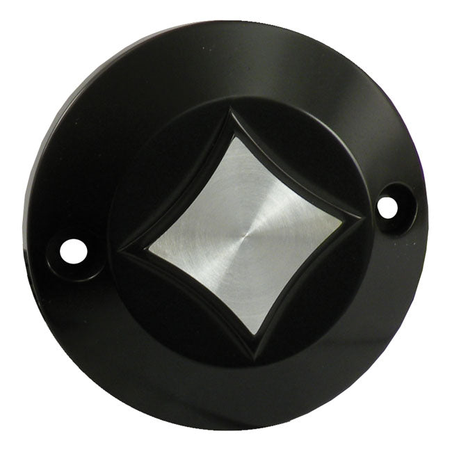 Black powder coated CNC machined with a contrast cut machined finish. Inspired on the classic card game that has been around some 600 years, insuring this point cover will not go out of style any time soon! Note: This point cover will fysically fit 71-03 Sportster models, but these have vertical mounting holes in the crankcase. This will influence the image since it must be rotated by 45 degrees to allow installation.